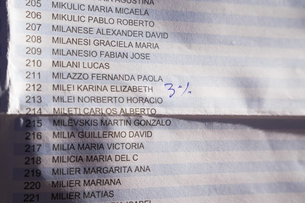 En la puerta de la misma institución educativa, apareció una intervención con birome en el padrón de electores exhibido en el ingreso, donde cada votante puede corroborar su inscripción. Allí, se dejó escrito “3%” al lado del nombre de la hermana del Presidente.