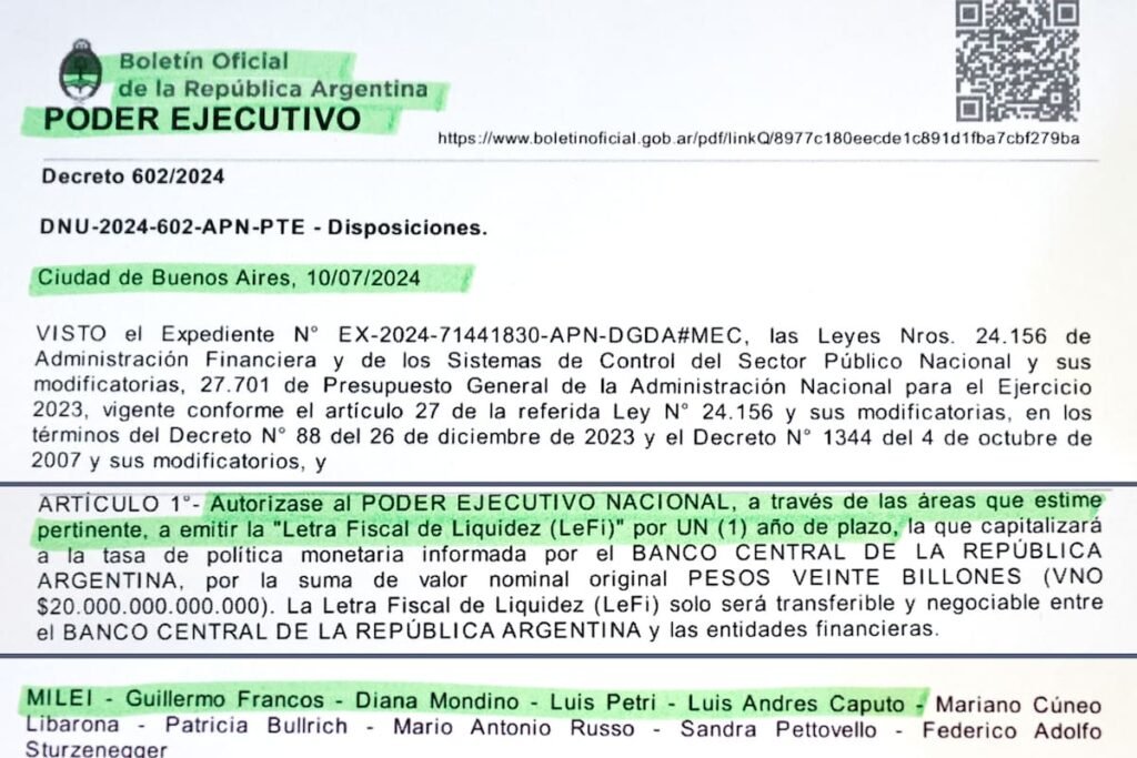 Basta repasar el artículo 1 de esa norma, firmada por el propio Caputo, para comprobarlo. Allí se autoriza al Poder Ejecutivo Nacional (PEN) a emitir la “Letra Fiscal de Liquidez (LeFi)” por un (1) año de plazo, la que capitalizará a la tasa de política monetaria informada por el BCRA y por un valor nominal original de $20 billones.