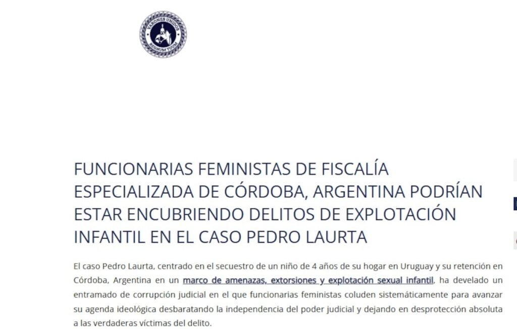 Durante meses, la página web de “Varones Unidos” publicó extensos textos sobre el “caso Pedro Laurta”, con acusaciones dirigidas al sistema judicial cordobés y a supuestas maniobras de la madre y la abuela materna del niño, con la supuesta complicidad de los tribunales provinciales. El relato central se basaba en la idea de que la Justicia cordobesa había “legitimado el secuestro internacional de un niño desde Uruguay”, según el título original del artículo.