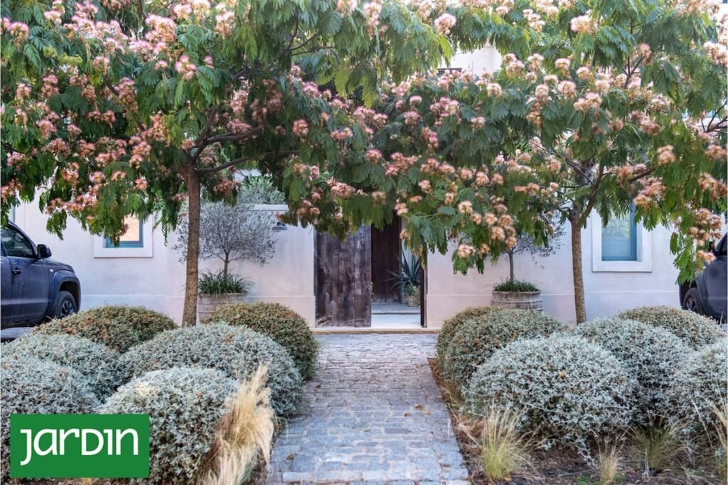 Un gran acierto fue enmarcar el ingreso con dos acacias de Constantinopla con teucrium bocha y stipas en la base, y dos olivos que acompañan con sus verdes grisáceos y su estilo provenzal.