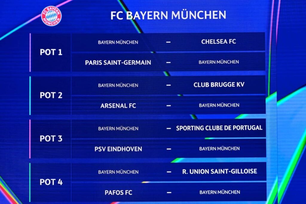• Bayern Múnich (Alemania): Chelsea (L), PSG (V), Brujas (L), Arsenal (V), Sporting Lisboa (L), PSV (V), Unión Saint Gilloise (L) y Pafos (V).