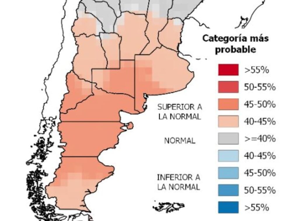 Respecto a las lluvias, se anticipan valores dentro de la normalidad para la zona del Litoral y gran parte de la Pampa Húmeda. Sin embargo, en las regiones de Cuyo y el noroeste del país, se prevé una probabilidad de lluvias entre un 45% y 50% por encima de lo normal, mientras que en el sur, desde Neuquén hasta Tierra del Fuego, se espera una primavera más seca, con precipitaciones inferiores a las habituales.
