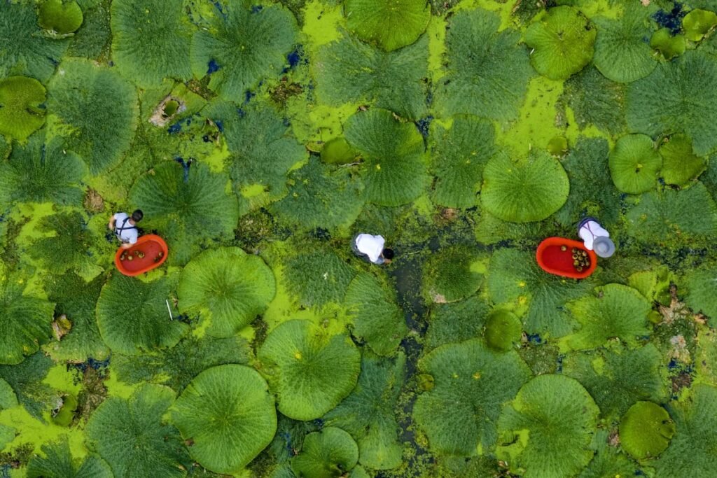 Existen plantas que no ofrecen resistencia a la cosecha, pero hay otras que desafían nuestro ingenio y resistencia en condiciones de trabajo difíciles y, a veces, peligrosas desde hace milenios. Un ejemplo es la fruta del dragón, conocida también como pitaya; la aparentemente inofensiva castaña de cajú, cuya cáscara es venenosa; y el nenúfar espinoso (Euryale ferox), que no es un nenúfar, pero es un pariente cercano, cuyas semillas se cosechan en China y Japón desde el Neolítico. Sus tallos, hojas y frutos están cubiertos de espinas afiladas, lo que, combinado con el agua y el lodo en el que crece, convierte su cosecha en un desafío. En la imagen, se observa a los agricultores de la aldea de Huisheng, en China, trabajando entre las enormes hojas de más de dos metros de diámetro de esta planta.